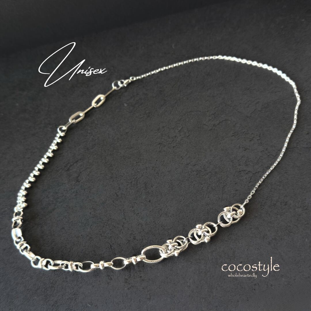 多様なデザインチェーンが特徴のこのネックレスは、シンプルさと存在感を兼ね備えています。
